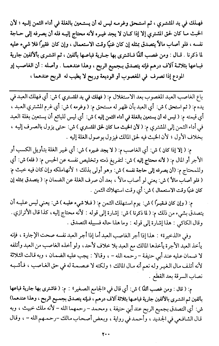 م: (إلا إذا كان) ش: أي الغاصب م: (لا يجد غيره) ش: أي غير الغلة بتأويل الكسب أو الأجر أو المال م: (لأنه محتاج إليه) ش: لتفريغ ذمته وتخليص نفسه عن الحبس م: (فله) ش: أي وللمحتاج م: (أن يصرفه إلى حاجة نفسه) ش: وهو أولى بذلك؛ لأنها ملكه وإن كان فيه خبث م: (فلو أصاب مالا) ش: يعني لو أصاب مالا، بعد أن صرف الغلة عن الضمان م: (يتصدق بمثله إن كان غنيا وقت الاستعمال) ش: أي وقت استهلاك الثمن.