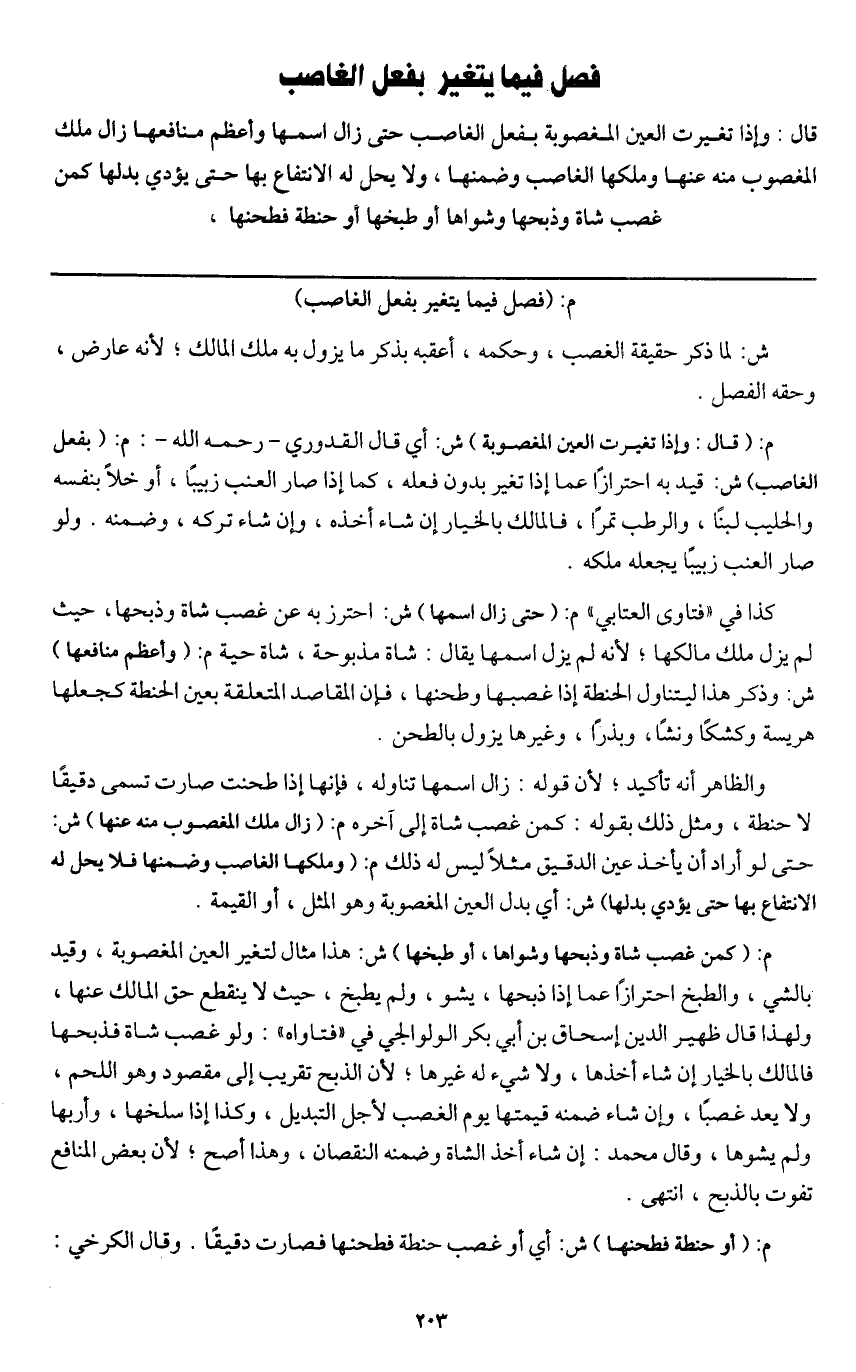 فصل فيما يتغير بفعل الغاصب قال: وإذا تغيرت العين المغصوبة بفعل الغاصب حتى زال اسمها وأعظم منافعها زال ملك المغصوب منه عنها وملكها الغاصب وضمنها فلا يحل له الانتفاع بها حتى يؤدي بدلها كمن غصب شاة وذبحها وشواها، أو طبخها أو حنطة فطحنها