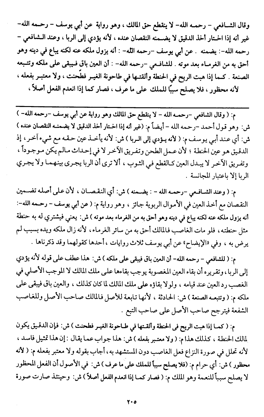 ـــــــــــــــــــــــــــــQم: (وقال الشافعي - رَحِمَهُ اللَّهُ - لا ينقطع حق المالك وهو رواية عن أبي يوسف - رَحِمَهُ اللَّهُ -) ش: وهو قول أحمد - رَحِمَهُ اللَّهُ - أيضا م: (غير أنه إذا اختار أخذ الدقيق لا يضمنه النقصان عنده) ش: أي عند أبي يوسف م: (لأنه يؤدي إلى الربا) ش: لأنه يأخذ عين حقه مع شيء آخر، إذ الدقيق هو عين الحنطة؛ لأن عمل الطحن وتفريق الآخر لا في إحداث ما لم يكن موجودا، وتفريق الآخر لا يبدل العين كالقطع في الثوب، ألا ترى أن الربا يجري بينهما ولا يجري الربا إلا باعتبار المجانسة.