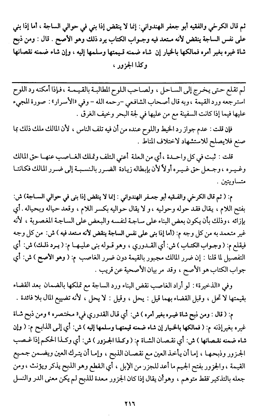 ثم قال الكرخي والفقيه أبو جعفر الهندواني: إنما لا ينقض إذا بنى في حوالي الساجة، أما إذا بنى على نفس الساجة ينقض؛ لأنه متعد فيه وجواب الكتاب يرد ذلك وهو الأصح. قال: ومن ذبح شاة غيره بغير أمره فمالكها بالخيار إن شاء ضمنه قيمتها وسلمها إليه، وإن شاء ضمنه نقصانها وكذا الجزور.