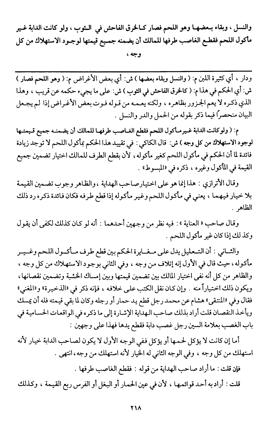 والثاني: أن التعليل يدل على مغايرة الحكم بين قطع طرف مأكول اللحم وغير مأكوله، حيث قال في الأول إنه إتلاف من وجه، وفي الثاني بوجود الاستهلاك من كل وجه، والظاهر من كل أنه نفى اختيار المالك بين تضمين قيمتها وبين إمساك الخشبة وتضمين نقصانها، ويكون ذلك اختيارا منه. وإن كان نقل الكتب على خلافه، فإنه ذكر في " الذخيرة " و " المغني " فقال وفي " المنتقى " هشام عن محمد رجل قطع يد حمار أو رجله وكان لما بقي قيمته فله أن يمسك ويأخذ النقصان، قلت: أراد بذلك صاحب الهداية الإشارة إلى ما ذكره في الواقعات الحسامية في باب الغصب بعلامة السين رجل غصب دابة فقطع يدها فهذا على وجهين: