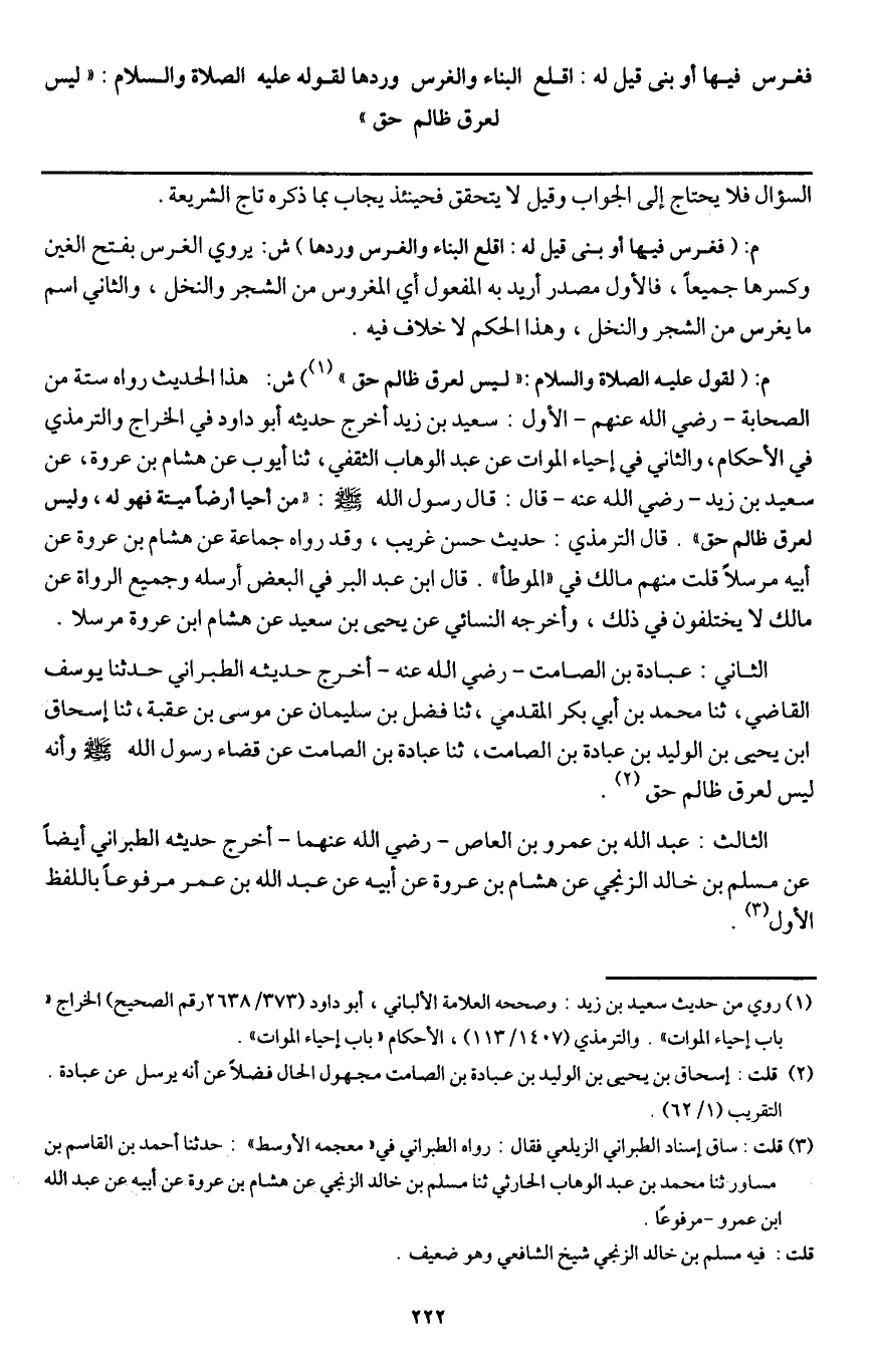 الثاني: عبادة بن الصامت - رَضِيَ اللَّهُ عَنْهُ - أخرج حديثه الطبراني حدثنا يوسف القاضي، ثنا محمد بن أبي بكر المقدمي، ثنا فضل بن سليمان عن موسى بن عقبة، ثنا إسحاق بن يحيى بن الوليد بن عبادة بن الصامت، ثنا عبادة بن الصامت عن قضاء رسول الله - صَلَّى اللَّهُ عَلَيْهِ وَسَلَّمَ - «وأنه ليس لعرق ظالم حق» .