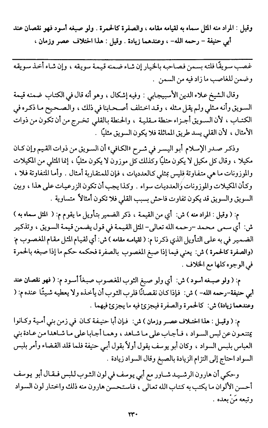 وذكر صدر الإسلام أبو اليسر في شرح " الكافي " أن السويق من ذوات القيم وإن كان مكيلا، وقال كل مكيل لا يكون مثليا وكذلك كل موزون لا يكون مثليا، إنما المثلي من المكيلات والموزونات ما هي متفاوتة فليس بمثلي كالعدديات، فإن للمتقاربة أمثال. وأما المتفاوتة فلا، وكأن المكيلات والموزونات والعديات سواء. وكذا يجب أن تكون الزرعيات على هذا، وبين السويق والسويق قد يكون تفاوت فاحش بسبب القلي فلا تكون أمثالا متساوية.