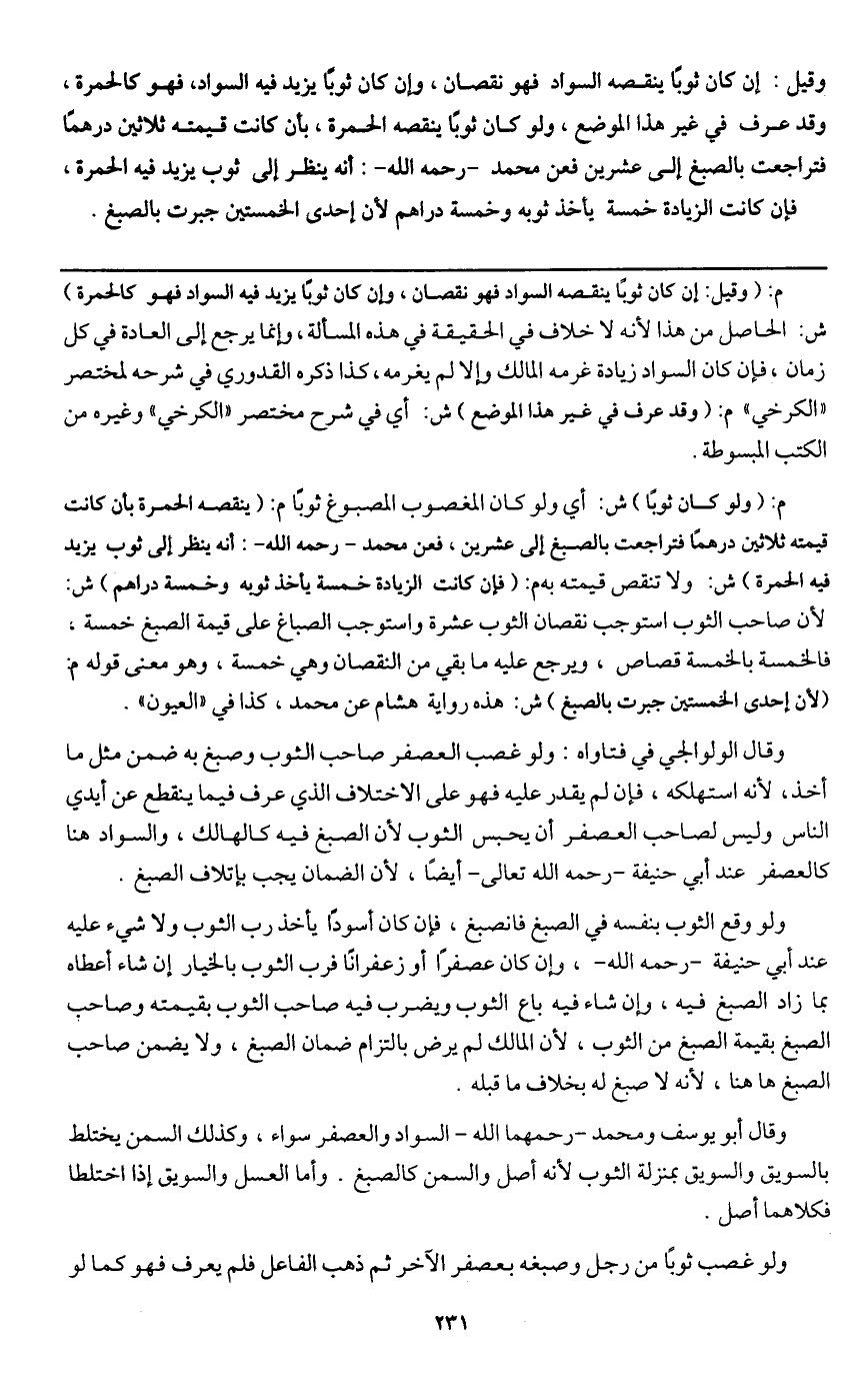 ـــــــــــــــــــــــــــــQم: (وقيل: إن كان ثوبا ينقصه السواد فهو نقصان، وإن كان ثوبا يزيد فيه السواد فهو كالحمرة) ش: الحاصل من هذا لأنه لا خلاف في الحقيقة في هذه المسألة، وإنما يرجع إلى العادة في كل زمان، فإن كان السواد زيادة غرمه المالك وإلا لم يغرمه، كذا ذكره القدوري في شرحه لمختصر " الكرخي " م: (وقد عرف في غير هذا الموضع) ش: أي في شرح مختصر " الكرخي " وغيره من الكتب المبسوطة ".
