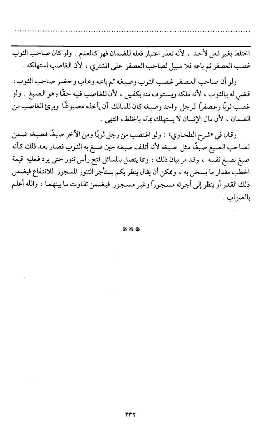 وقال في " شرح الطحاوي ": ولو اغتصب من رجل ثوبا ومن الآخر صبغا فصبغه ضمن لصاحب الصبغ صبغا مثل صبغه؛ لأنه أتلف صبغه حين صبغ به الثوب فصار بعد ذلك كأنه صبغ بصبغ نفسه، وقد مر بيان ذلك، ومما يتصل بالمسائل فتح رأس تنور حتى يرد فعليه قيمة الحطب مقدار ما يسخن به، وممكن أن يقال ينظر بكم يستأجر التنور المسجور للانتفاع فيضمن ذلك القدر أو ينظر إلى أجرته مسجورا وغير مسجور فيضمن تفاوت ما بينهما، والله أعلم بالصواب.