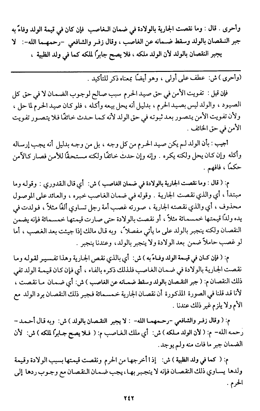 م: (وقال زفر والشافعي رحمهما الله: لا يجبر النقصان بالولد) ش: وبه قال أحمد - رَحِمَهُ اللَّهُ - م: (لأن الولد ملكه) ش: أي ملك الغاصب م: (فلا يصح جابرا لملكه) ش: لأن الضمان جبر ما فات منه ولم يوجد.