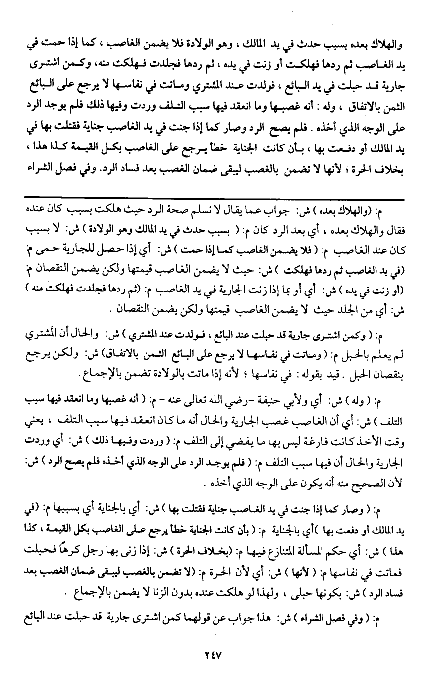 والهلاك بعده بسبب حدث في يد المالك، وهو الولادة فلا يضمن الغاصب، كما إذا حمت في يد الغاصب ثم ردها فهلكت أو زنت في يده، ثم ردها فجلدت فهلكت منه، وكمن اشترى جارية قد حبلت في يد البائع، فولدت عند المشتري وماتت في نفاسها لا يرجع على البائع الثمن بالاتفاق، وله: أنه غصبها وما انعقد فيها سبب التلف وردت وفيها ذلك فلم يوجد الرد على الوجه الذي أخذه. فلم يصح الرد وصار كما إذا جنت في يد الغاصب جناية فقتلت بها في يد المالك أو دفعت بها، بأن كانت الجناية خطأ يرجع على الغاصب بكل القيمة كذا هذا، بخلاف الحرة، لأنها لا تضمن بالغصب ليبقى ضمان الغصب بعد فساد الرد. وفي فصل الشراء