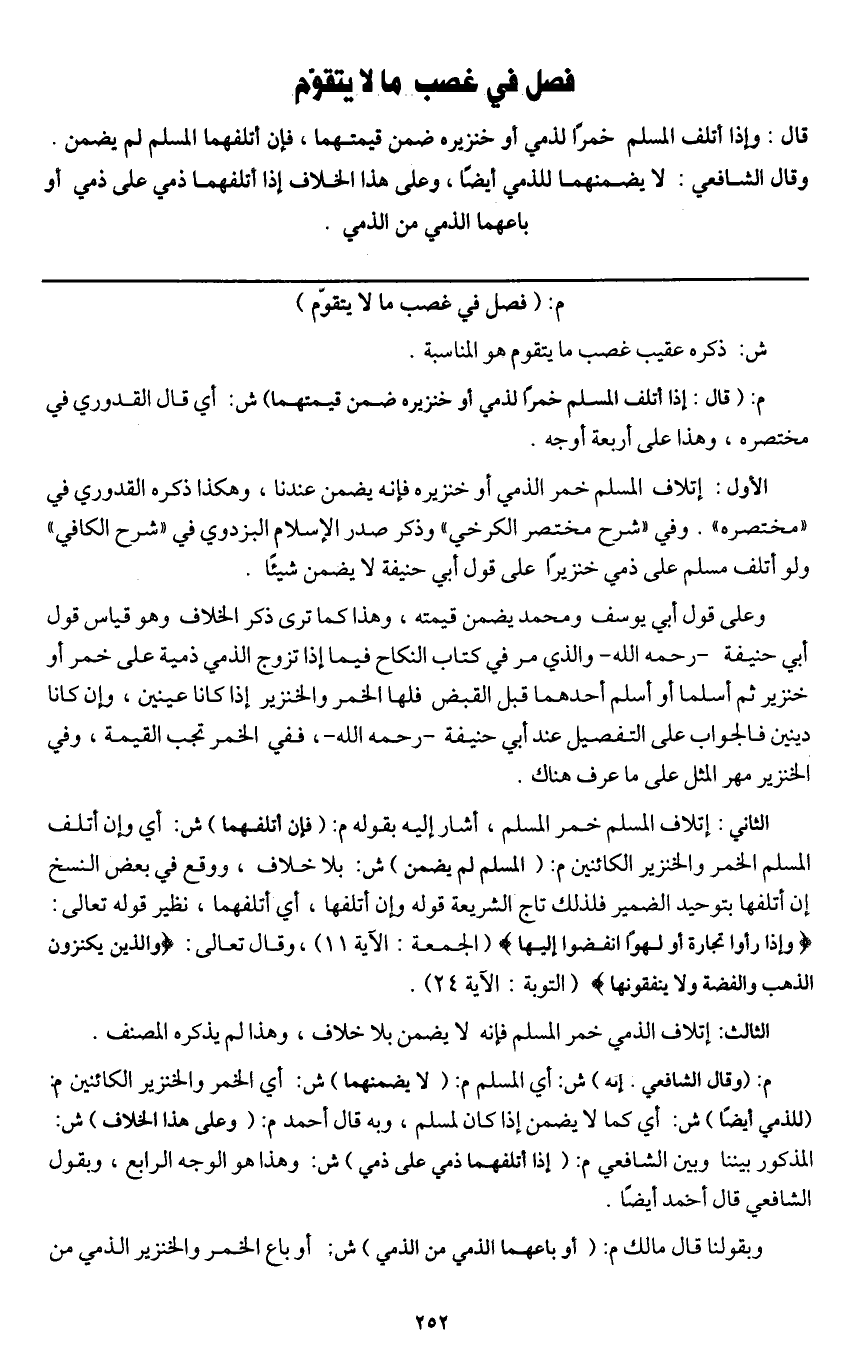 فصل في غصب ما لا يتقوم قال: وإذا أتلف المسلم خمرا لذمي أو خنزيره ضمن قيمتهما، فإن أتلفهما لمسلم لم يضمن. وقال الشافعي: لا يضمنهما للذمي أيضا، وعلى هذا الخلاف إذا أتلفهما ذمي على ذمي أو باعهما الذمي من الذمي.