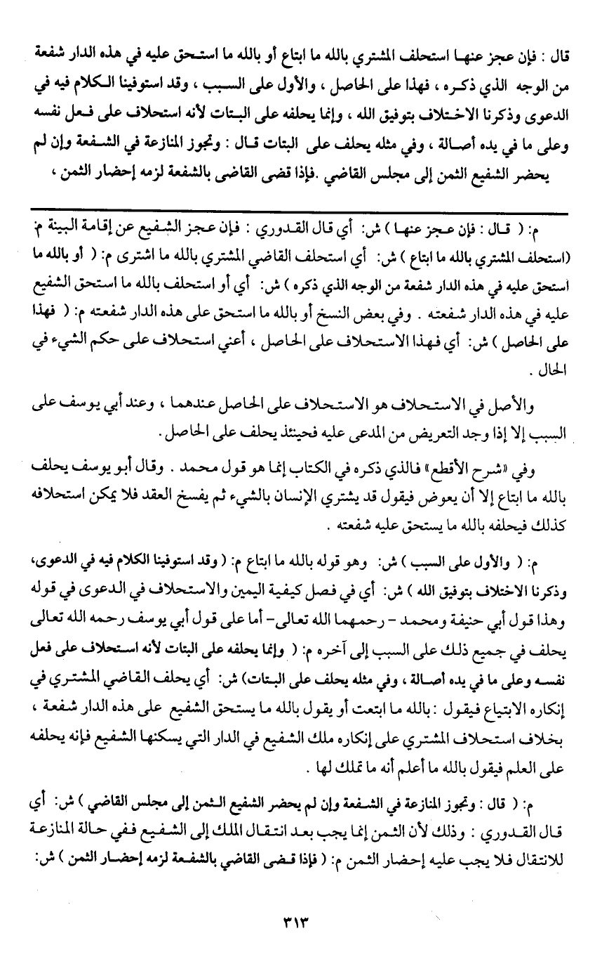 وفي " شرح الأقطع " فالذي ذكره في الكتاب إنما هو قول محمد. وقال أبو يوسف: يحلف بالله ما ابتاع إلا أن يعوض فيقول قد يشتري الإنسان بالشيء ثم يفسخ العقد فلا يمكن استحلافه كذلك فيحلفه بالله ما يستحق عليه شفعته.