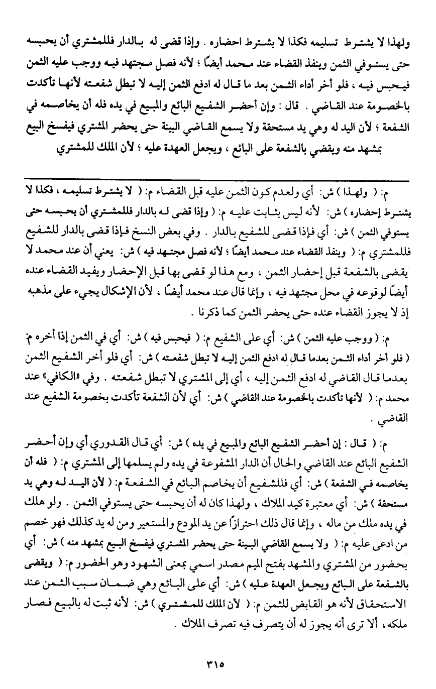 ولهذا لا يشترط تسليمه فكذا لا يشترط إحضاره. وإذا قضى له بالدار فللمشتري أن يحبسه حتى يستوفي الثمن وينفذ القضاء عند محمد أيضا؛ لأنه فصل مجتهد فيه ووجب عليه الثمن فيحبس فيه، فلو أخر أداء الثمن بعد ما قال له ادفع الثمن إليه لا تبطل شفعته لأنها تأكدت بالخصومة عند القاضي.