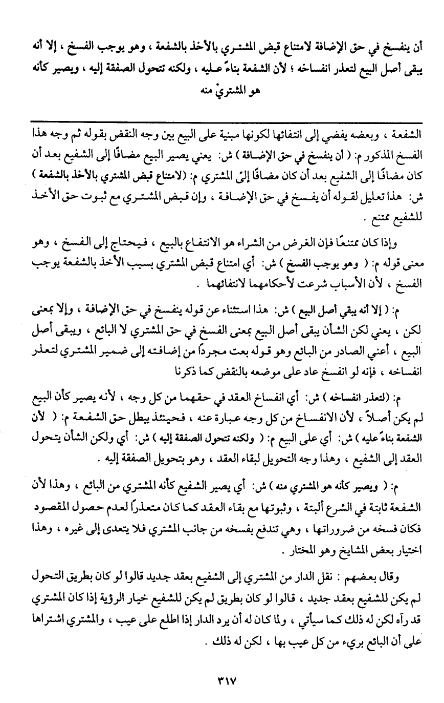 وقال بعضهم: نقل الدار من المشتري إلى الشفيع بعقد جديد قالوا لو كان بطريق التحول لم يكن للشفيع بعقد جديد، قالوا لو كان بطريق لم يكن للشفيع خيار الرؤية إذا كان المشتري قد رآه لكن له ذلك كما سيأتي ولما كان له أن يرد الدار إذا اطلع على عيب، والمشتري اشتراها على أن البائع بريء من كل عيب بها، لكن له ذلك.