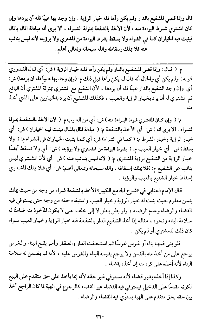 قال الإمام العتابي في " شرح الجامع الكبير " الأخذ بالشفعة شراء من وجه من حيث يملك بثمن معلوم حيث يثبت له خيار الرؤية وخيار العيب واستيفاء حقه من وجه حتى يستوفي فيه القضاء والرضاء وعدم الرضاء، ولو بطل يبطل لا إلى خلف حتى لا يكون المأخوذ منه ضامنا له سلامة البناء ونحوه، مثاله إذا أخذ الشفيع الدار بالشفعة فله خيار الرؤية وخيار العيب سواء كان ذلك للمشتري أو لم يكن.