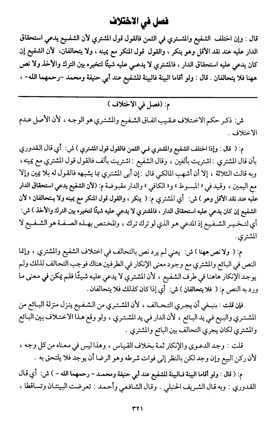 فصل في الاختلاف قال: وإن اختلف الشفيع والمشتري في الثمن فالقول قول المشتري لأن الشفيع يدعي استحقاق الدار عليه عند نقد الأقل وهو ينكر، والقول قول المنكر مع يمينه، ولا يتحالفان؛ لأن الشفيع إن كان يدعي عله استحقاق الدار، فالمشتري لا يدعي عليه شيئا لتخيره بين الترك والأخذ ولا نص هاهنا فلا يتحالفان.