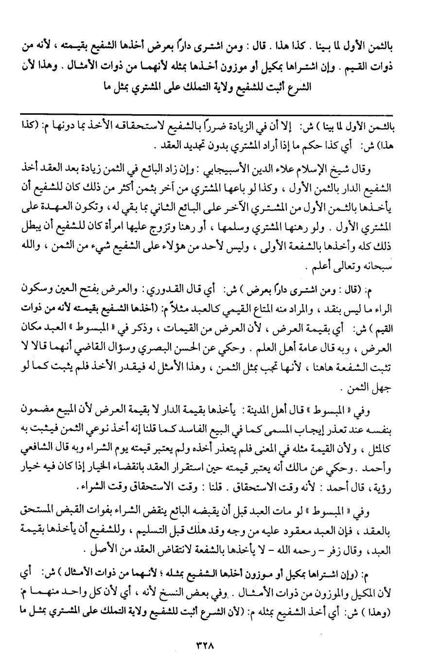 بالثمن الأول لما بينا. كذا هذا. قال: ومن اشترى دارا بعرض أخذها الشفيع بقيمته؛ لأنه من ذوات القيم. وإن اشتراها بمكيل أو موزون أخذها بمثله لأنهما من ذوات الأمثال. وهذا لأن الشرع أثبت للشفيع ولاية التملك على المشتري بمثل ما