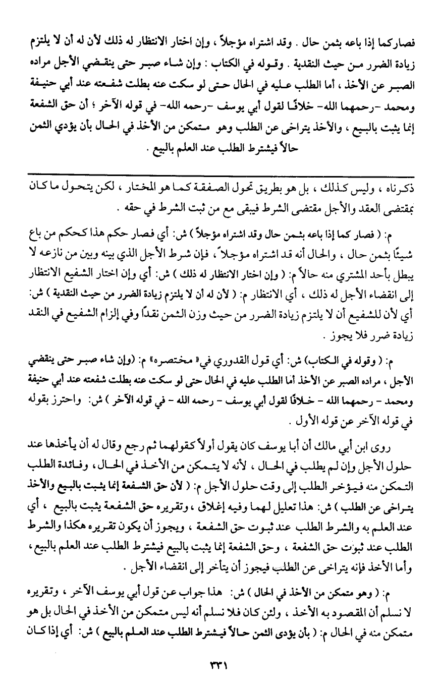 م: (وقوله في الكتاب) ش: أي قول القدوري في "مختصره" م: (وإن شاء صبر حتى ينقضي الأجل، مراده الصبر عن الأخذ أما الطلب عليه في الحال حتى لو سكت عنه بطلت شفعته عند أبي حنيفة ومحمد رحمهما الله خلافا لقول أبي يوسف - رَحِمَهُ اللَّهُ - في قوله الآخر) ش: واحترز بقوله في قوله الآخر عن قوله الأول.