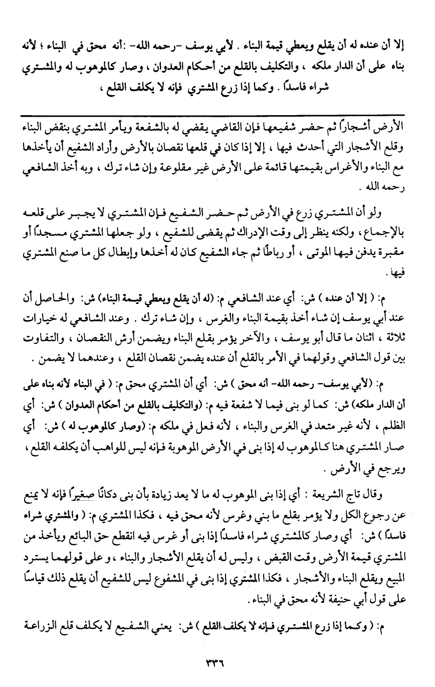 ـــــــــــــــــــــــــــــQالأرض أشجارا ثم حضر شفيعها فإن القاضي يقضي له بالشفعة ويأمر المشتري بنقض البناء وقلع الأشجار التي أحدث فيها، إلا إذا كان في قلعها نقصان بالأرض وأراد الشفيع أن يأخذها مع البناء والأغراس بقيمتها قائمة على الأرض غير مقلوعة وإن شاء ترك، وبه أخذ الشافعي - رَحِمَهُ اللَّهُ -.