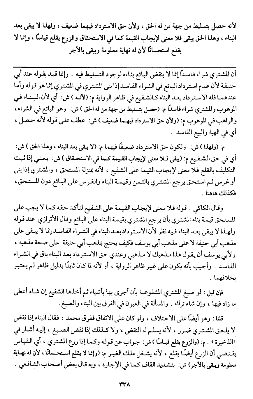 وقال الكاكي: قوله فلا معنى لإيجاب القيمة على الشفيع لتأكد حقه كما لا يجب على المستحق قيمة بناء المشتري بأن يرجع المشتري بقيمة البناء على البائع وقال الأترازي عند قوله ولهذا لا يبقى بعد البناء فيه نظر لأن الاسترداد بعد البناء في الشراء الفاسد إنما لا يبقى على مذهب أبي حنيفة لا على مذهب أبي يوسف فكيف يحتج بمذهب أبي حنيفة على صحة مذهبه، ولأبي يوسف أن يقول هذا مذهبك لا مذهبي وعندي حق الاسترداد بعد البناء باق في الشراء الفاسد. وأجيب بأنه يكون على غير ظاهر الرواية، أو لأنه لما كان ثابتا بدليل ظاهر لم يعتبر بخلافهما.