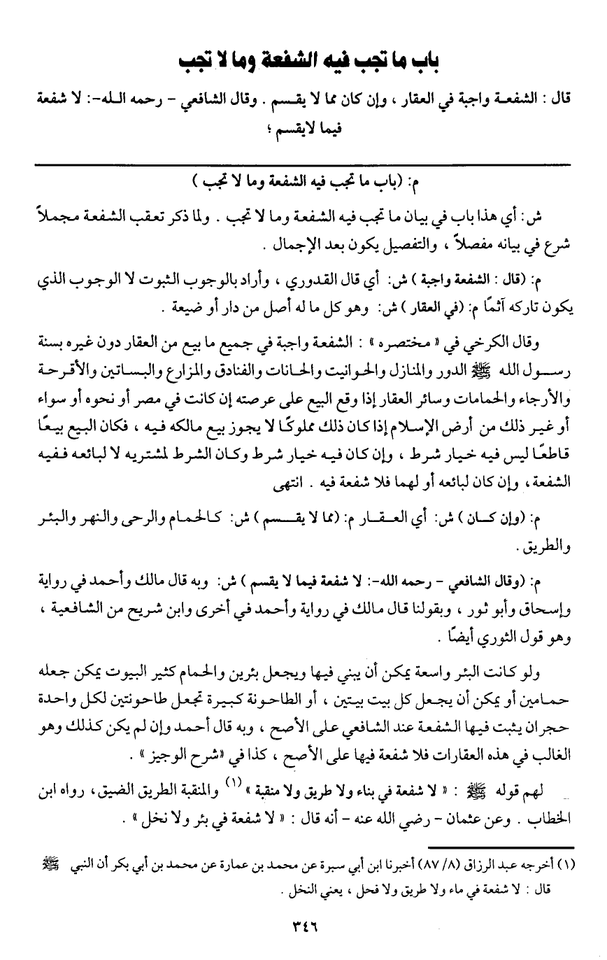 ش: أي هذا باب في بيان ما تجب فيه الشفعة وما لا تجب. ولما ذكر تعقب الشفعة مجملا شرع في بيانه مفصلا، والتفصيل يكون بعد الإجمال.