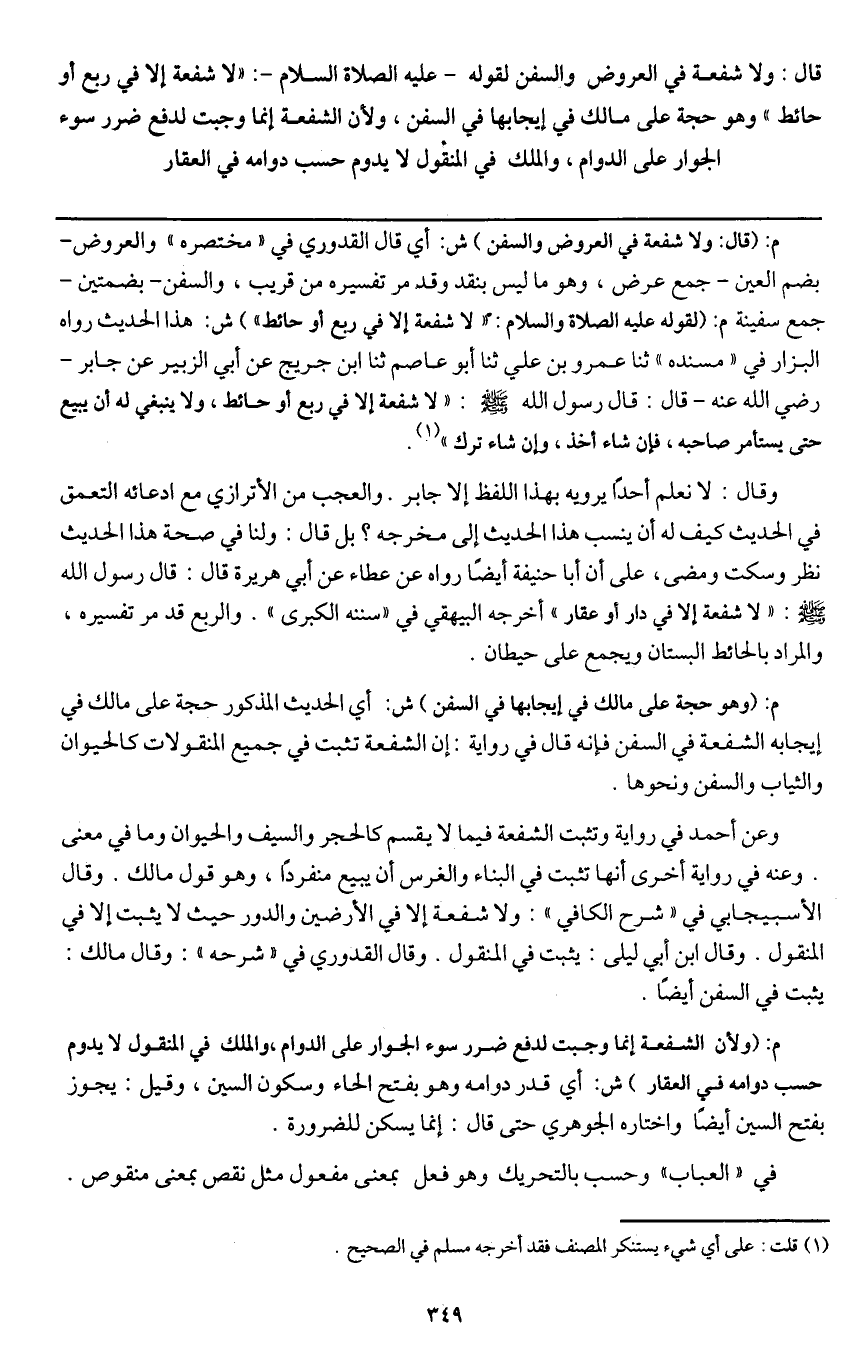 م: (قال: ولا شفعة في العروض والسفن) ش: أي قال القدوري "مختصره" والعروض بضم العين جمع عرض، وهو ما ليس بنقد وقد مر تفسيره من قريب، والسفن بضمتين جمع سفينة م: (لقوله - عَلَيْهِ الصَّلَاةُ وَالسَّلَامُ -: «لا شفعة إلا في ربع أو حائط» ش: هذا الحديث رواه البزار في "مسنده" ثنا عمرو بن علي ثنا أبو عاصم ثنا ابن جريج عن أبي الزبير عن جابر - رَضِيَ اللَّهُ عَنْهُ - قال: قال رسول الله - صَلَّى اللَّهُ عَلَيْهِ وَسَلَّمَ -: «لا شفعة إلا في ربع أو حائط، ولا ينبغي له أن يبيع حتى يستأمر صاحبه، فإن شاء أخذ، وإن شاء ترك» .