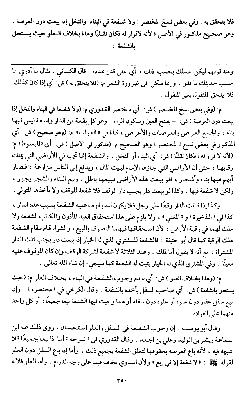 م: (وفي بعض نسخ المختصر) ش: أي مختصر القدوري م: (ولا شفعة في البناء والنخل إذا بيعت دون العرصة) ش: بفتح العين وسكون الراء وهو كل بقعة من الدار واسعة ليس فيها بناء، والجمع العراص والعرصات والأعراص، كذا في " العباب " م: (وهو صحيح) ش: أي المذكور في بعض نسخ " المختصر " وهو الصحيح م (مذكور في الأصل) ش: أي " المسبوط " م: (لأنه لا قرار له فكان نقليا) ش: أي البناء أو النخل. والشفعة إنما تجب في الأراضي التي يملك رقابها، حتى إن الأراضي التي جازها الإمام لبيت المال، ويدفع إلى الناس مزارعة، فصار أيهم فيها بناء وأشجار، فلو بيعت هذه الأراضي فبيعها باطل. وبيع البناء والشجر يجوز، ولكن لا شفعة فيها. وكذا لو بيعت دار بجنب دار الوقف فلا شفعة للوقف ولا يأخذها المتولي.