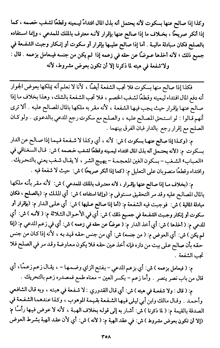 وكذا إذا صالح عنها بسكوت لأنه يحتمل أنه بذل المال افتداء ليمينه وقطعا لشغب خصمه، كما إذا أنكر صريحا بخلاف ما إذا صالح عنها بإقرار لأنه معترف بالملك للمدعي، وإنما استفاده بالصلح فكان مبادلة مالية. أما إذا صالح عليها بإقرار أو سكوت أو إنكار وجبت الشفعة في جميع ذلك؛ لأنه أخذها عوضا عن حقه في زعمه إذا لم يكن من جنسه فيعامل بزعمه.