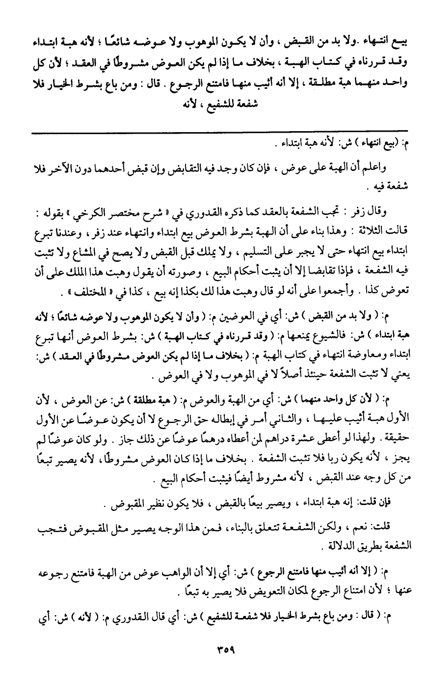 م: (ولا بد من القبض) ش: أي في العوضين م: (وأن لا يكون الموهوب ولا عوضه شائعا؛ لأنه هبة ابتداء) ش: فالشيوع يمنعها م: (وقد قررناه في كتاب الهبة) ش: بشرط العوض أنها تبرع ابتداء ومعاوضة انتهاء في كتاب الهبة م: (بخلاف ما إذا لم يكن العوض مشروطا في العقد) ش: يعني لا تثبت الشفعة حينئذ أصلا لا في الموهوب ولا في العوض.