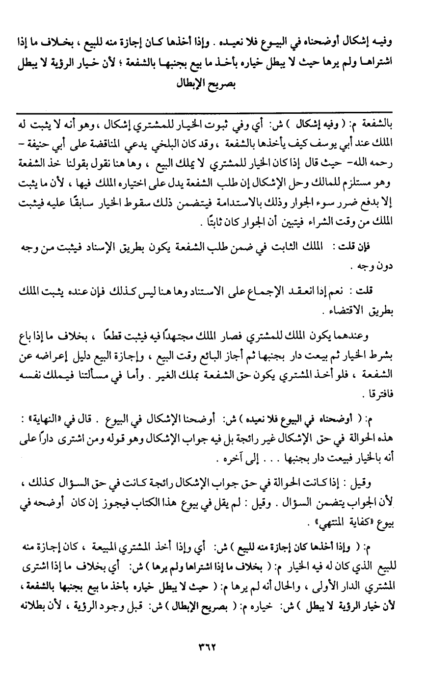 ـــــــــــــــــــــــــــــQبالشفعة م: (وفيه إشكال) ش: أي وفي ثبوت الخيار للمشتري إشكال، وهو أنه لا يثبت له الملك عند أبي يوسف كيف يأخذها بالشفعة، وقد كان البلخي يدعي المناقضة على أبي حنيفة - رَحِمَهُ اللَّهُ - حيث قال: إذا كان الخيار للمشتري لا يملك البيع، وهاهنا نقول بقولنا خذ الشفعة، وهو مستلزم للمالك وحل الإشكال إن طلب الشفعة يدل على اختياره الملك فيها؛ لأن ما يثبت إلا بدفع ضرر سوء الجوار وذلك بالاستدامة فيتضمن ذلك سقوط الخيار سابقا عليه فيثبت الملك من وقت الشراء فيتبين أن الجوار كان ثابتا.