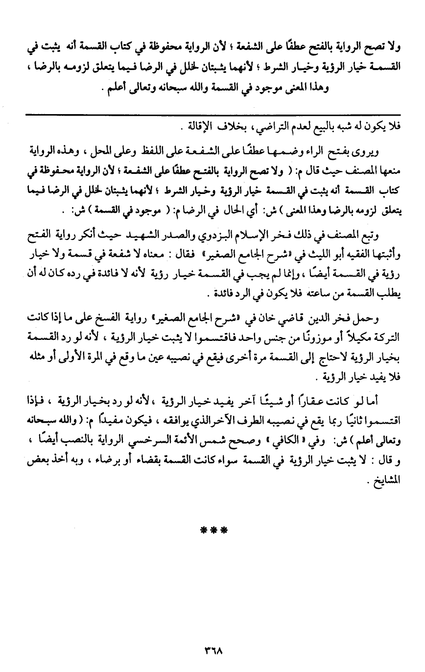 ولا تصح الرواية بالفتح عطفا على الشفعة؛ لأن الرواية محفوظة في كتاب القسمة أنه يثبت في القسمة خيار الرؤية وخيار الشرط؛ لأنهما يثبتان لخلل في الرضا فيما يتعلق لزومه بالرضا، وهذا المعنى موجود في القسمة والله سبحانه وتعالى أعلم.