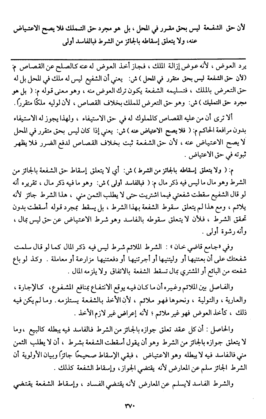 والحاصل: أن كل عقد تعلق جوازه بالجائز من الشرط فالفاسد فيه يبطله كالبيع، وما لا يتعلق جوازه بالجائز من الشرط وهو أن يقول أسقطت الشفعة بشرط، أن لا يطلب الثمن مني فالفاسد فيه لا يبطله وهو الاعتياض، فبقي الإسقاط صحيحا جائزا وبيان الأولوية أن الشرط الجائز سلم عن المعارض لأنه يقتضي الجواز، وإسقاط الشفعة كذلك.