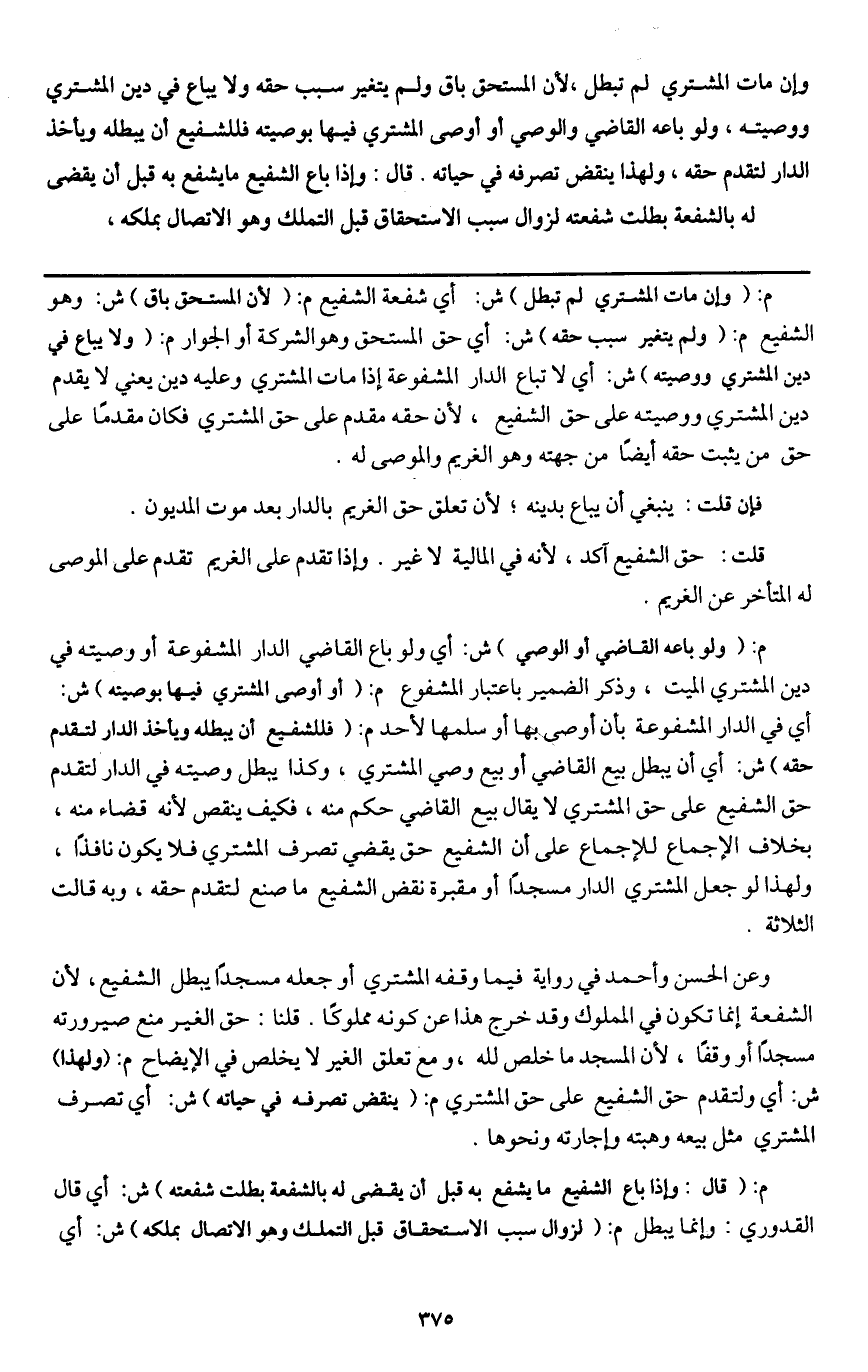 ـــــــــــــــــــــــــــــQم: (وإن مات المشتري لم تبطل) ش: أي شفعة الشفيع م: (لأن المستحق باق) ش: وهو الشفيع م: (ولم يتغير سبب حقه) ش: أي حق المستحق وهو الشركة أو الجوار م: (ولا يباع في دين المشتري ووصيته) ش: أي لا تباع الدار المشفوعة إذا مات المشتري وعليه دين يعني لا يقدم دين المشتري ووصيته على حق الشفيع؛ لأن حقه مقدم على حق المشتري فكان مقدما على حق من يثبت حقه أيضا من جهته وهو الغريم والموصى له.