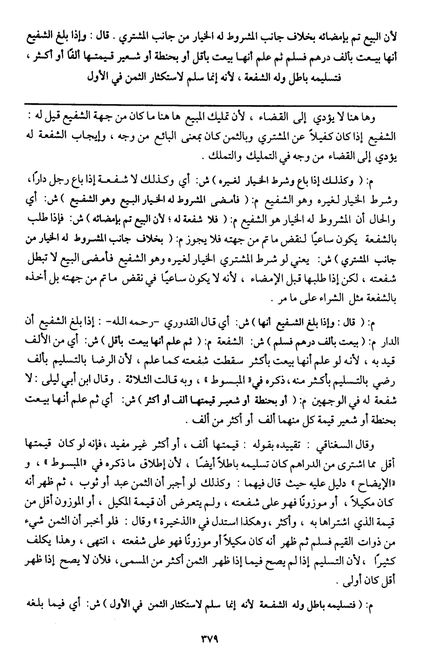 ـــــــــــــــــــــــــــــQوهاهنا لا يؤدي إلى القضاء؛ لأن تمليك المبيع هاهنا ما كان من جهة الشفيع قيل له: الشفيع إذا كان كفيلا عن المشتري وبالثمن كان بمعنى البائع من وجه، وإيجاب الشفعة له يؤدي إلى القضاء من وجه في التمليك والتملك.