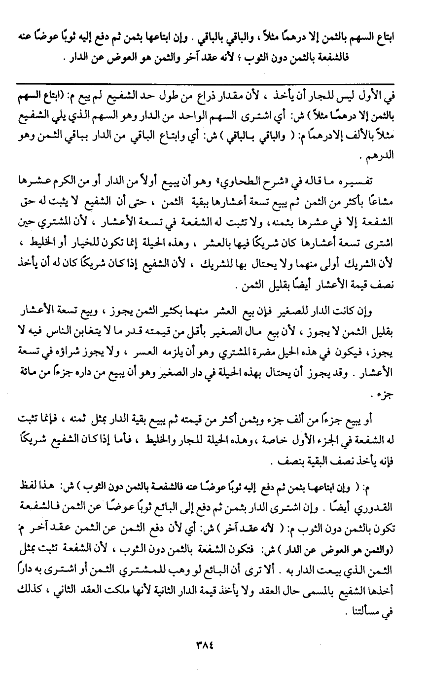 أو يبيع جزءا من ألف جزء وبثمن أكثر من قيمته ثم يبيع بقية الدار بمثل ثمنه، فإنما تثبت له الشفعة في الجزء الأول خاصة، وهذه الحيلة للجار والخليط، فأما إذا كان الشفيع شريكا فإنه يأخذ نصف البقية بنصف.