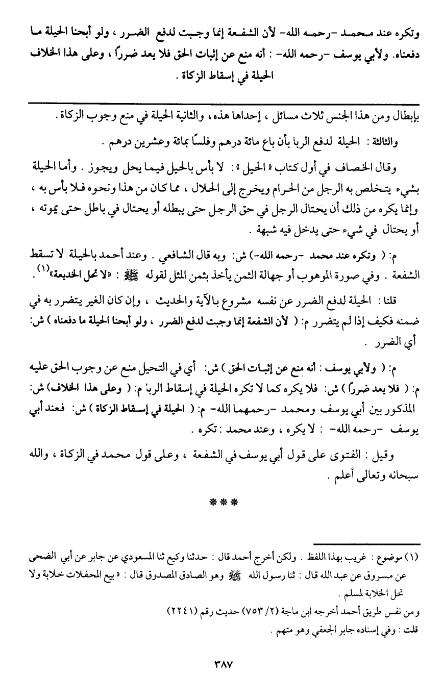 وتكره عند محمد - رَحِمَهُ اللَّهُ - لأن الشفعة إنما وجبت لدفع الضرر، ولو أبحنا الحيلة ما دفعناه. ولأبي يوسف - رَحِمَهُ اللَّهُ -: أنه منع عن إثبات الحق فلا يعد ضررا، وعلى هذا الخلاف الحيلة في إسقاط الزكاة.