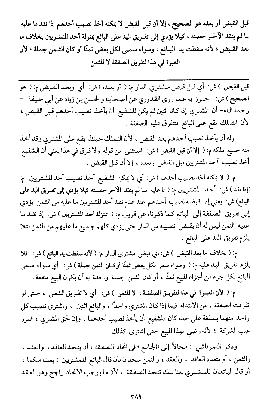 ـــــــــــــــــــــــــــــQقبل القبض) ش: أي قبل قبض مشتري الدار م: (أو بعده) ش: أي وبعد القبض م: (هو الصحيح) ش: احترز به عما روى القدوري عن أصحابنا، والحسن بن زياد عن أبي حنيفة - رَحِمَهُ اللَّهُ - أن المشتري إذا كانا اثنين لم يكن للشفيع أن يأخذ نصيب أحدهم قبل القبض، لأن التملك يقع على البائع فتتفرق عليه الصفقة.