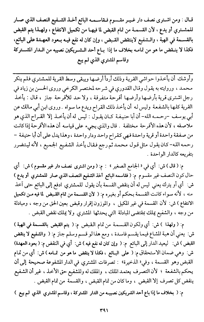 ـــــــــــــــــــــــــــــQوأوشك أن يأخذوا حواشي القرية وذلك أردأ أرضها ويبقى وسط القرية للمشتري فلم ينكر محمد، وروايته به يقول: وقال القدوري في شرحه لمختصر الكرخي وروى الحسن بن زياد في رجل اشترى قرية بأرضها وأرضها أقرحة متفرقة، ولا حد للأقرحة جاز، قال: يأخذ القرية كلها بالشفعة وليس له أن يأخذ ذلك القراح ويدع ما سواه.