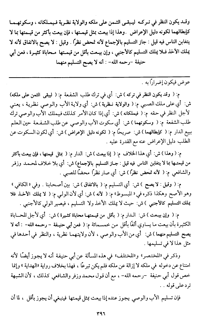 وقد يكون النظر في تركه ليبقى الثمن على ملكه والولاية نظرية فيملكانه، وسكوتهما كإبطالهما لكونه دليل الإعراض. وهذا إذا بيعت بمثل قيمتها، فإن بيعت بأكثر من قيمتها بما لا يتغابن الناس فيه قيل: جاز التسليم بالإجماع لأنه تمحض نظرا. وقيل: لا يصح بالاتفاق لأنه لا يملك الأخذ فلا يملك التسليم كالأجنبي، وإن بيعت بأقل من قيمتها محاباة كثيرة، فعن أبي حنيفة - رَحِمَهُ اللَّهُ -: أنه لا يصح التسليم منهما