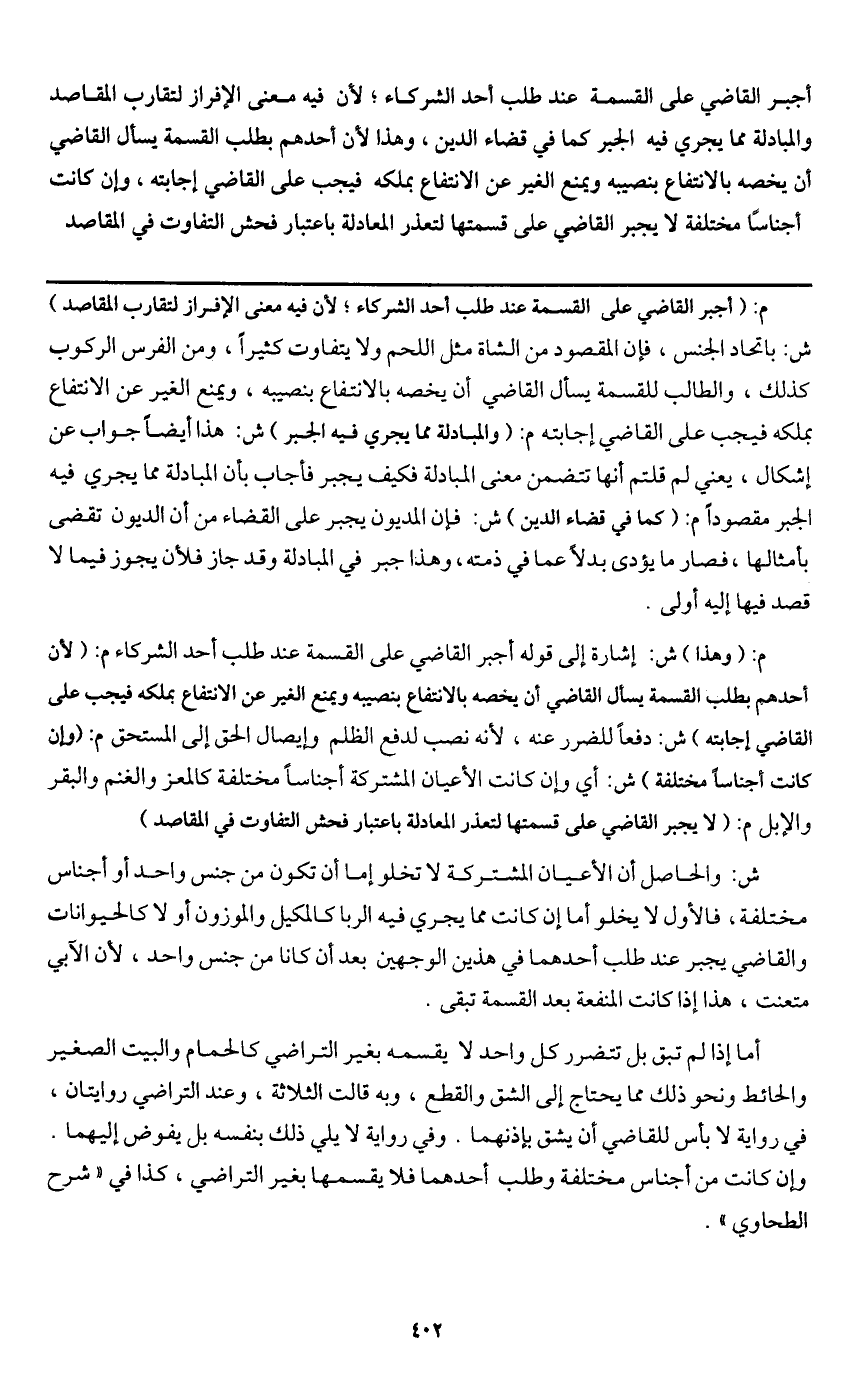 ش: والحاصل أن الأعيان المشتركة لا تخلو إما أن تكون من جنس واحد أو أجناس مختلفة. فالأول لا يخلو أما إن كانت مما يجري فيه الربا كالمكيل والموزون أو لا كالحيوانات والقاضي يجبر عند طلب أحدهما في هذين الوجهين بعد أن كانا من جنس واحد، لأن الآبي متعنت، هذا إذا كانت المنفعة بعد القسمة تبقى.