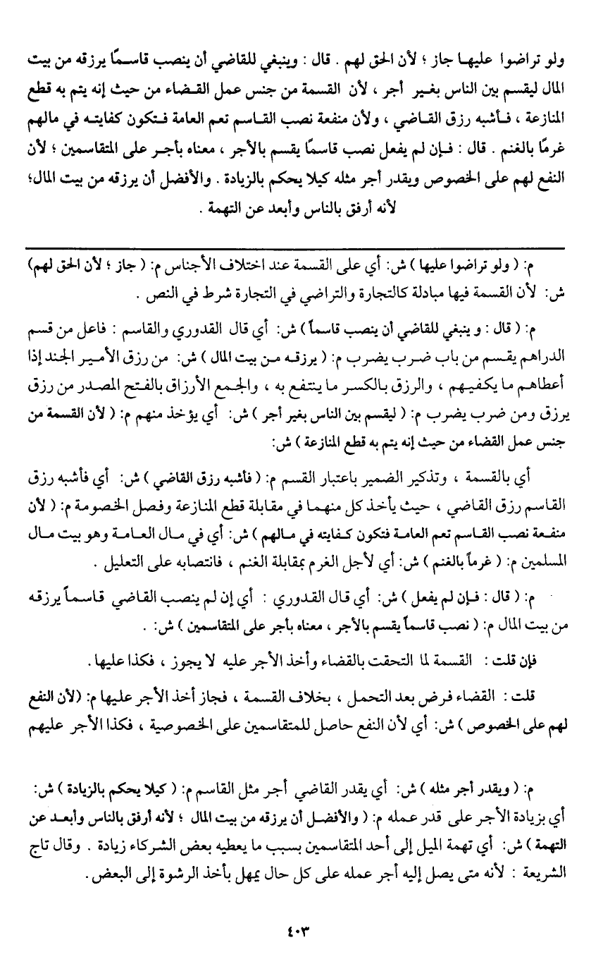 أي بالقسمة، وتذكير الضمير باعتبار القسم م: (فأشبه رزق القاضي) ش: أي فأشبه رزق القاسم رزق القاضي، حيث يأخذ كل منهما في مقابلة قطع المنازعة وفصل الخصومة م: (لأن منفعة نصب القاسم تعم العامة فتكون كفايته في مالهم) ش: أي في مال العامة وهو بيت مال المسلمين م: (غرما بالغنم) ش: أي لأجل الغرم بمقابلة الغنم، فانتصابه على التعليل.
