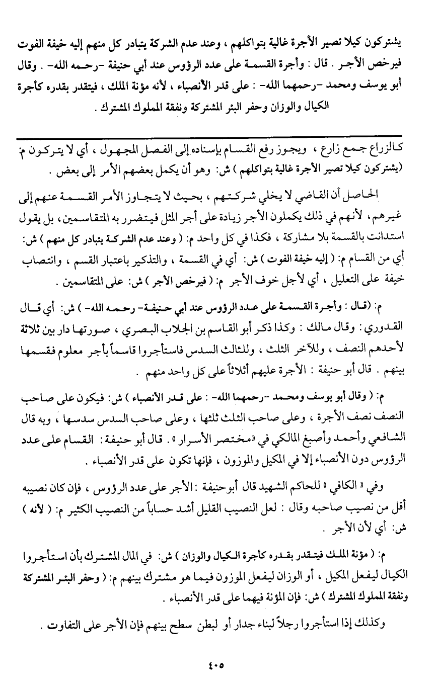 قال: وأجرة القسمة على عدد الرؤوس عند أبي حنيفة - رَحِمَهُ اللَّهُ -. وقال أبو يوسف ومحمد - رحمهما الله -: على قدر الأنصباء، لأنه مؤنة الملك، فيتقدر بقدره كأجرة الكيال والوزان وحفر البئر المشتركة ونفقة المملوك المشترك.