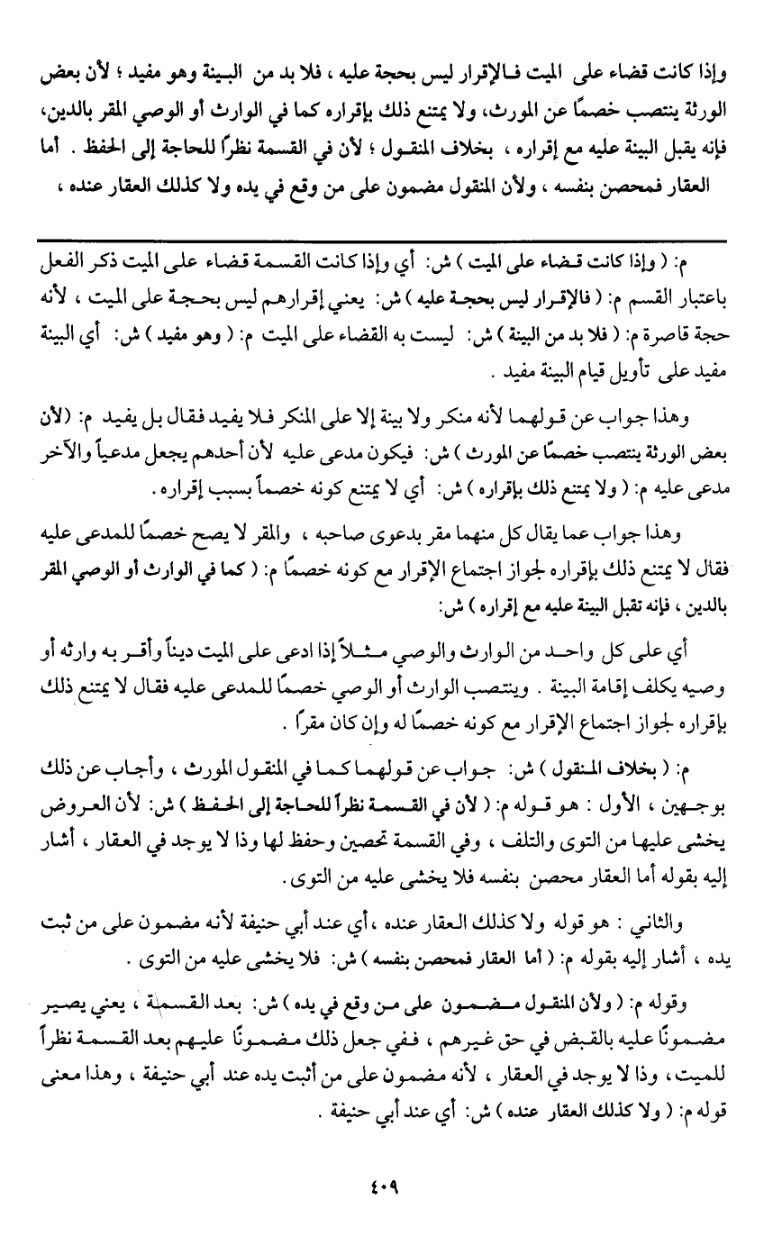 وإذا كانت قضاء على الميت فالإقرار ليس بحجة عليه، فلا بد من البينة وهو مفيد؛ لأن بعض الورثة ينتصب خصما عن المورث، ولا يمتنع ذلك بإقراره كما في الوارث أو الوصي المقر بالدين، فإنه يقبل البينة عليه مع إقراره، بخلاف المنقول؛ لأن في القسمة نظرا للحاجة إلى الحفظ. أما العقار فمحصن بنفسه، ولأن المنقول مضمون على من وقع في يده ولا كذلك العقار عنده.