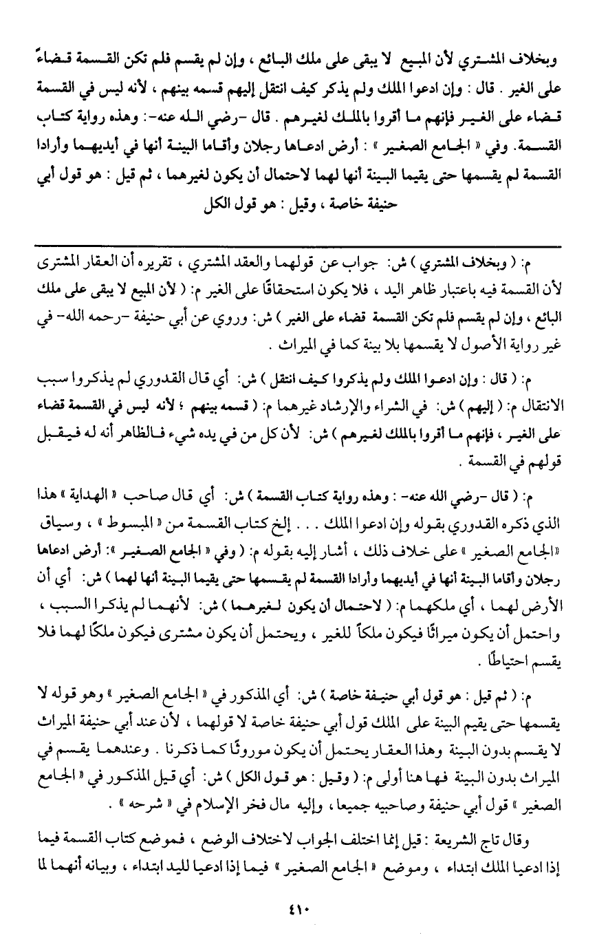 ـــــــــــــــــــــــــــــQم: (وبخلاف المشتري) ش: جواب عن قولهما والعقد المشترى، تقريره أن العقار المشترى لأن القسمة فيه باعتبار ظاهر اليد، فلا يكون استحقاقا على الغير م: (لأن المبيع لا يبقى على ملك البائع. وإن لم يقسم فلم تكن القسمة قضاء على الغير) ش: وروي عن أبي حنيفة - رَحِمَهُ اللَّهُ - في غير رواية الأصول لا يقسمها بلا بينة كما في الميراث.
