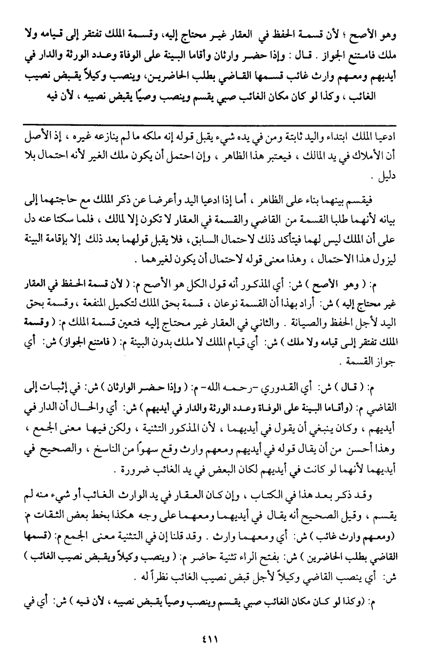م: (وهو الأصح) ش: أي المذكور أنه قول الكل هو الأصح م: (لأن قسمة الحفظ في العقار غير محتاج إليه) ش: أراد بهذا أن القسمة نوعان، قسمة بحق الملك لتكميل المنفعة، وقسمة بحق اليد لأجل الحفظ والصيانة. والثاني في العقار غير محتاج إليه فتعين قسمة الملك م: (وقسمة الملك تفتقر إلى قيامه ولا ملك) ش: أي قيام الملك لا ملك بدون البينة م: (فامتنع الجواز) ش: أي جواز القسمة.