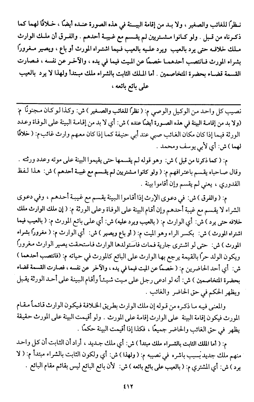 نظرا للغائب والصغير، ولا بد من إقامة البينة في هذه الصورة عنده أيضا، خلافا لهما كما ذكرناه من قبل. ولو كانوا مشتريين لم يقسم مع غيبة أحدهم. والفرق أن ملك الوارث ملك خلافه حتى يرد بالعيب ويرد عليه بالعيب فيما اشتراه المورث أو باع، ويصير مغرورا بشراء المورث فانتصب أحدهما خصما عن الميت فيما في يده، والآخر عن نفسه، فصارت القسمة قضاء بحضرة المتخاصمين.
