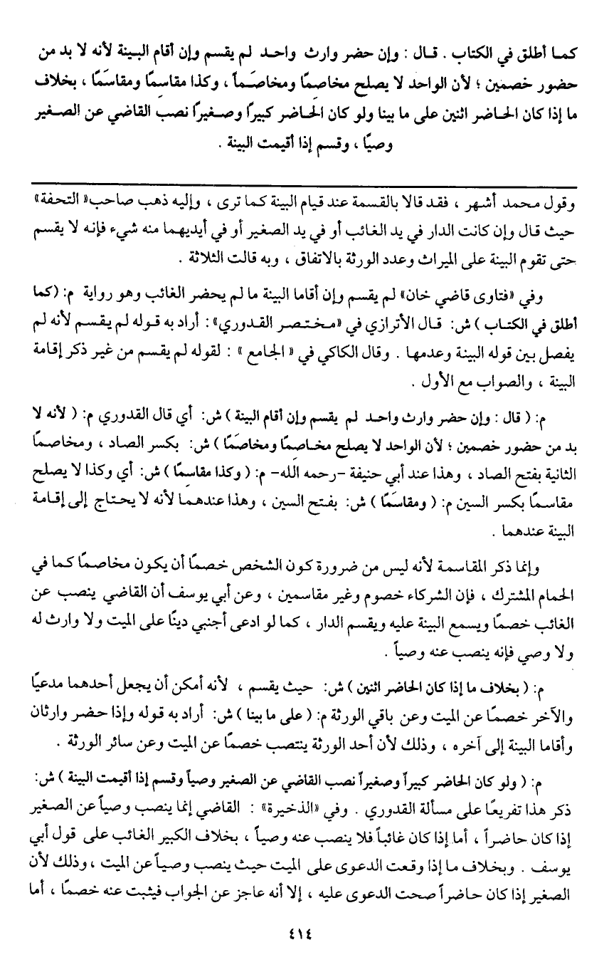 ـــــــــــــــــــــــــــــQوقول محمد أشهر، فقد قالا بالقسمة عند قيام البينة كما ترى، وإليه ذهب صاحب " التحفة " حيث قال وإن كانت الدار في يد الغائب أو في يد الصغير أو في أيديهما منه شيء فإنه لا يقسم حتى تقوم البينة على الميراث وعدد الورثة بالاتفاق، وبه قالت الثلاثة.