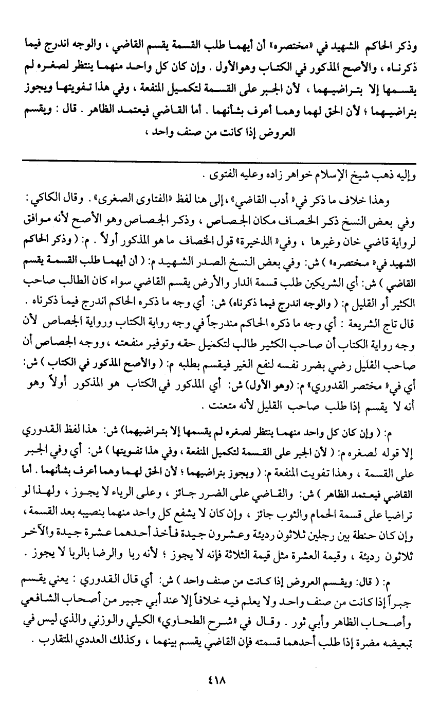 وهذا خلاف ما ذكر في " أدب القاضي "، إلى هنا لفظ " الفتاوى الصغرى ". وقال الكاكي: وفي بعض النسخ ذكر الخصاف مكان الجصاص، وذكر الجصاص وهو الأصح لأنه موافق لرواية قاضي خان وغيرها، وفي " الذخيرة " قول الخصاف ما هو المذكور أولا. م: (وذكر الحاكم الشهيد في "مختصره ") ش: وفي بعض النسخ الصدر الشهيد م: (أن أيهما طلب القسمة يقسم القاضي) ش: أي الشريكين طلب قسمة الدار والأرض يقسم القاضي سواء كان الطالب صاحب الكثير أو القليل م: (والوجه اندرج فيما ذكرناه) ش: أي وجه ما ذكره الحاكم اندرج فيما ذكرناه.