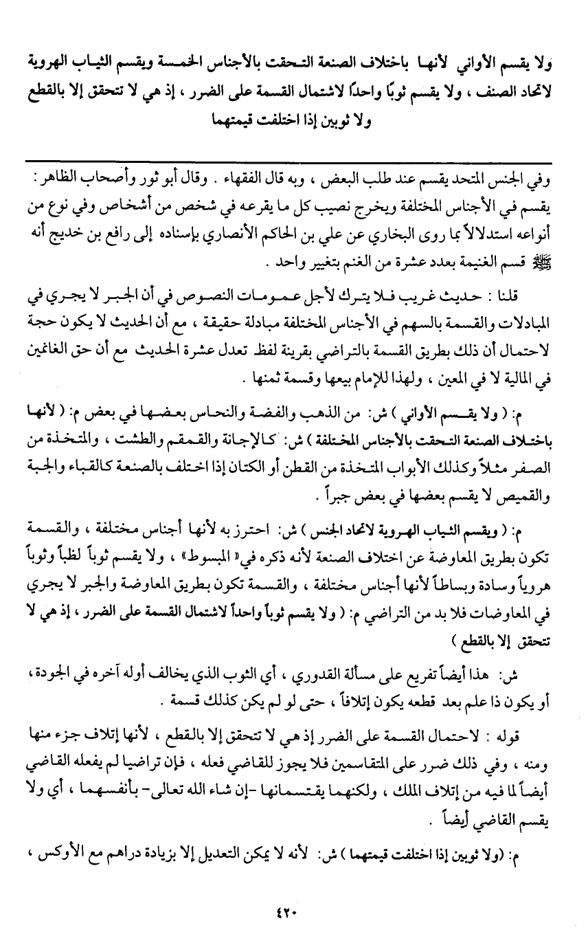 ـــــــــــــــــــــــــــــQوفي الجنس المتحد يقسم عند طلب البعض، وبه قال الفقهاء. وقال أبو ثور وأصحاب الظاهر: يقسم في الأجناس المختلفة ويخرج نصيب كل ما يقرعه في شخص من أشخاص وفي نوع من أنواعه استدلالا بما روى البخاري عن علي بن الحاكم الأنصاري بإسناده إلى رافع بن خديج «أنه - صَلَّى اللَّهُ عَلَيْهِ وَسَلَّمَ - قسم الغنيمة فعدل عشرة من الغنم ببعير واحد» .