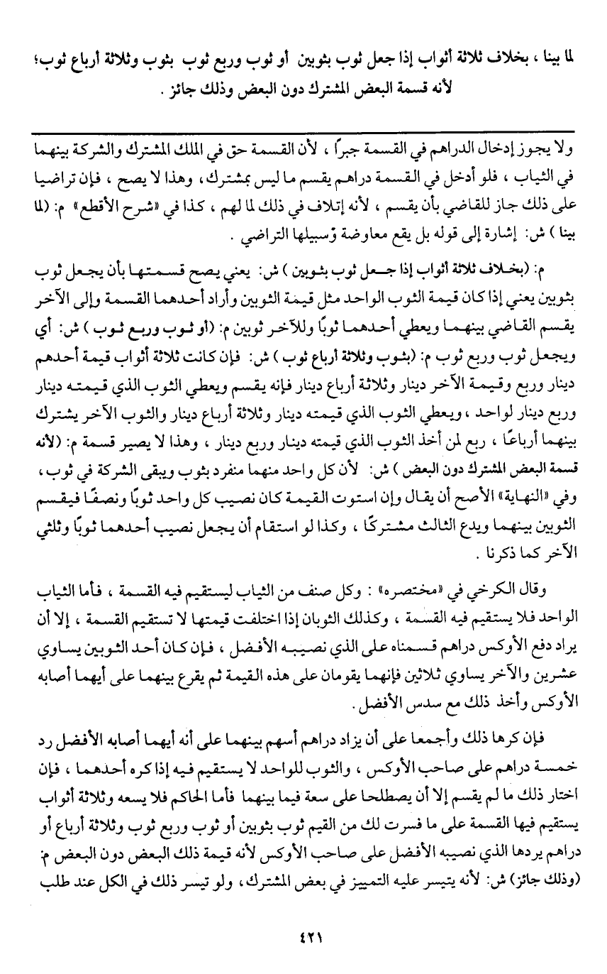 وقال الكرخي في "مختصره": وكل صنف من الثياب ليستقيم فيه القسمة، فأما الثوب الواحد فلا يستقيم فيه القسمة، وكذلك الثوبان إذا اختلفت قيمتها لا تستقيم القسمة، إلا أن يراد دفع الأوكس دراهم قسمناه على الذي نصيبه الأفضل، فإن كان أحد الثوبين يساوي عشرين والآخر يساوي ثلاثين فإنهما يقومان على هذه القيمة ثم يقرع بينهما على أيهما أصابه الأوكس وأخذ ذلك مع سدس الأفضل.