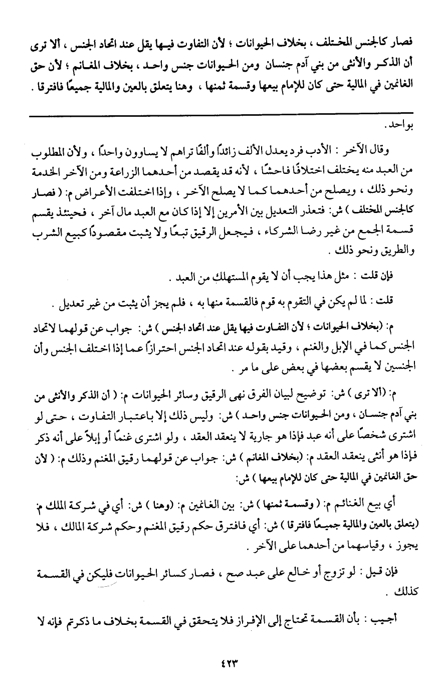 وقال الآخر: الأدب فرد يعدل الألف زائدا وألفا تراهم لا يساوون واحدا، ولأن المطلوب من العبد منه يختلف اختلافا فاحشا، لأنه قد يقصد من أحدهما الزراعة ومن الآخر الخدمة ونحو ذلك، ويصلح من أحدهما كما لا يصلح من الآخر، وإذا اختلفت الأعراض م: (فصار كالجنس المختلف) ش: فتعذر التعديل بين الأمرين إلا إذا كان مع العبد مال آخر، فحينئذ يقسم قسمة الجمع من غير رضا الشركاء، فيجعل الرقيق تبعا ولا يثبت مقصودا كبيع الشرب والطريق ونحو ذلك.