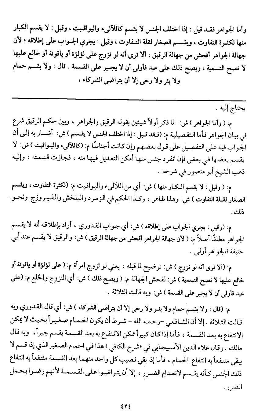 وأما الجواهر فقد قيل: إذا اختلف الجنس لا يقسم كاللآلئ واليواقيت، وقيل: لا يقسم الكبار منها لكثرة التفاوت، ويقسم الصغار لقلة التفاوت، وقيل: يجري الجواب على إطلاقه؛ لأن جهالة الجواهر أفحش من جهالة الرقيق، ألا ترى أنه لو تزوج على لؤلؤة أو ياقوتة أو خالع عليها لا تصح التسمية، ويصح ذلك على عبد فأولى أن لا يجبر على القسمة.