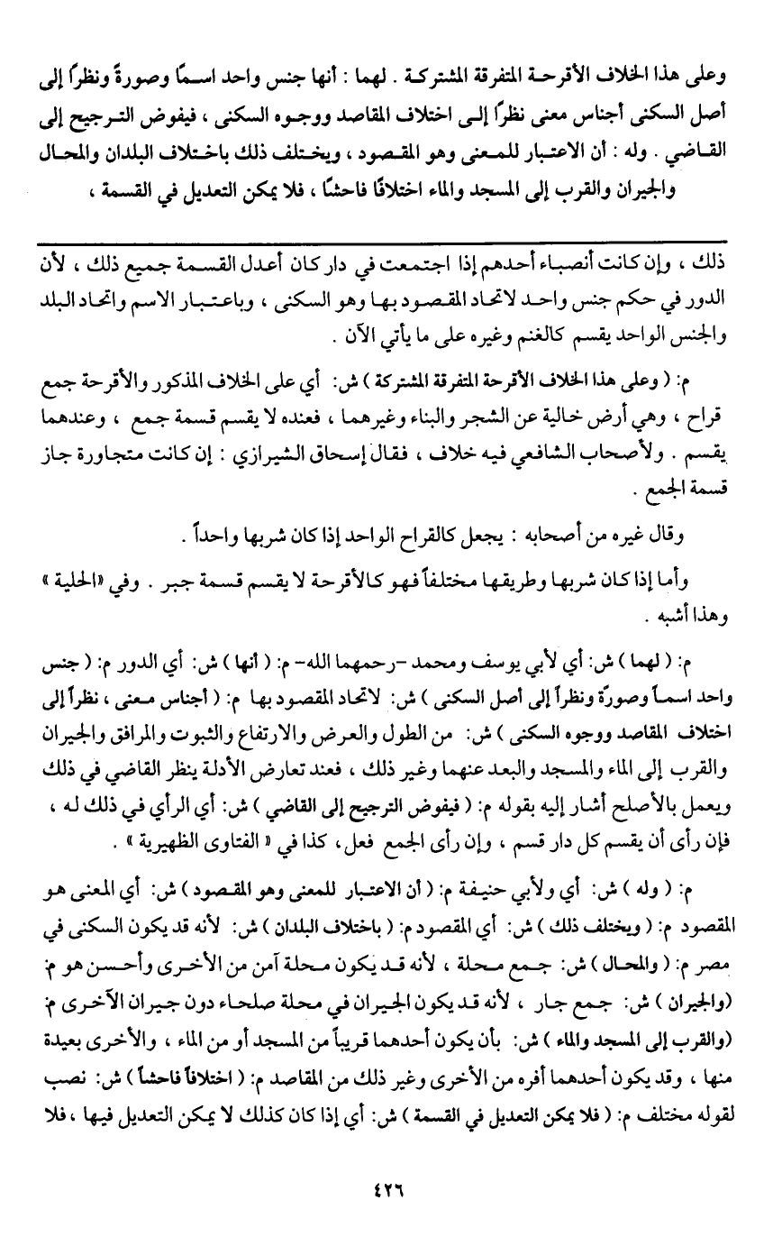 وعلى هذا الخلاف الأقرحة المتفرقة المشتركة. لهما: أنها جنس واحد اسما وصورة ونظرا إلى أصل السكنى أجناس معنى نظرا إلى اختلاف المقاصد ووجوه السكنى، فيفوض الترجيح إلى القاضي. وله: أن الاعتبار للمعنى وهو المقصود، ويختلف ذلك باختلاف البلدان والمحال والجيران والقرب إلى المسجد والماء اختلافا فاحشا، فلا يمكن التعديل في القسمة.